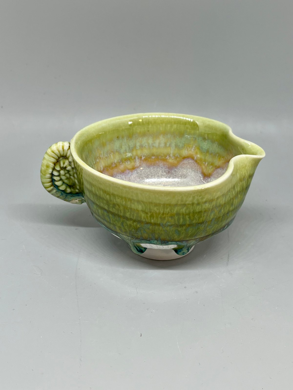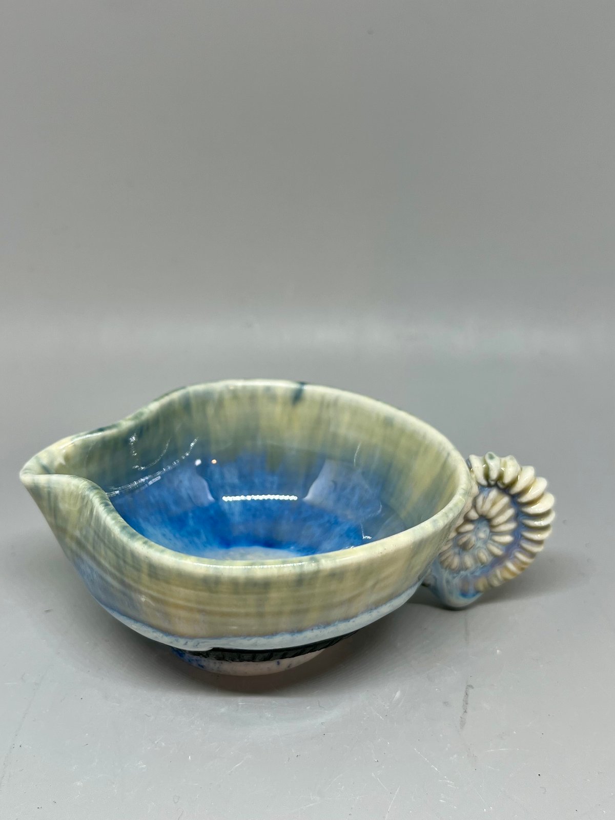 Small individual bowls for pouring cream or that special sauce over puddings and ice cream ,perfect for dipping sauces also with a ammonite shaped handles